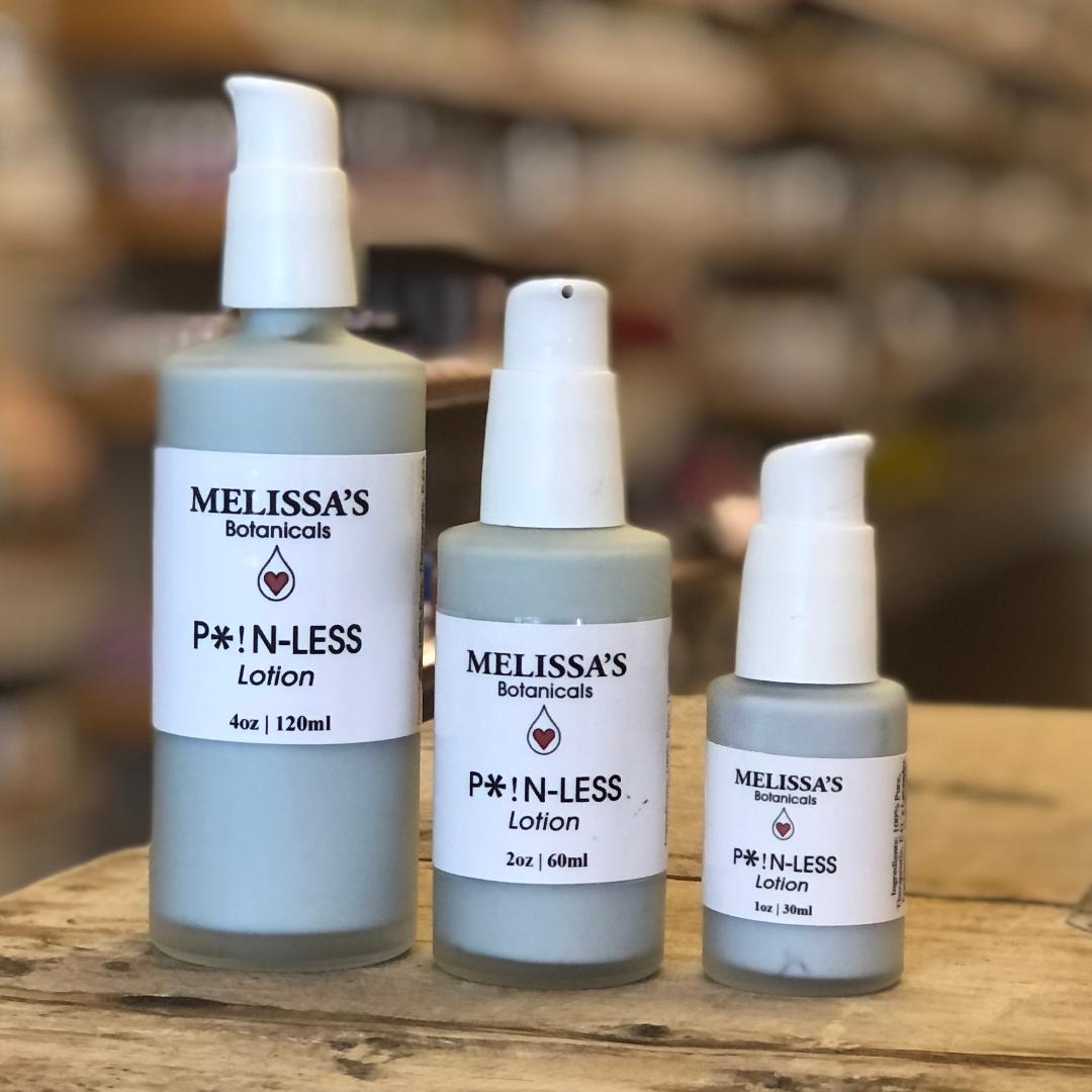 Melissa’s hand-crafted and scientifically formulated “Pain-Less” lotion has analgesic, anti-inflammatory, soothing and healing effects when used properly. Our Pain-Less lotion contains a powerful blend of 100% organic, therapeutic grade essential oils in a highly penetrating lotion base.