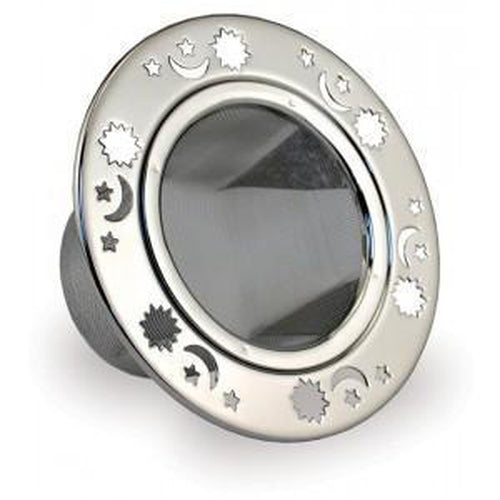 This stainless steel mesh strainer with features celestial cutouts of stars, moons, and bursts. Wide brim allows tea strainer to sit on the rim of a mug, and hot water is poured over the tea to fill the cup. Open shape gives more room for tea and herbs to expand during the brewing process.